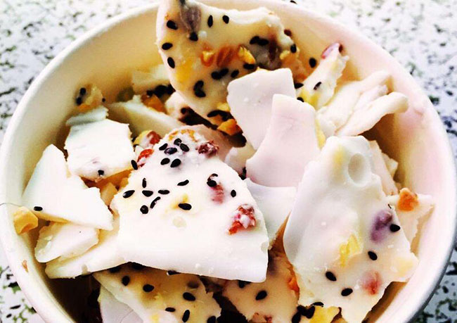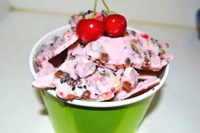 炒酸奶,以酸奶為主要原料,配以堅(jiān)果、新鮮水果等輔料,經(jīng)炒冰機(jī)快速制冷凝固而成,由于制作過(guò)程中用的是鏟子,制作動(dòng)作更象炒菜,故稱(chēng)之為炒酸奶。炒酸奶兼有有酸奶的營(yíng)養(yǎng)健康功效和冰淇淋的綿滑冰爽,適合于各個(gè)年齡階層的消費(fèi)人群。