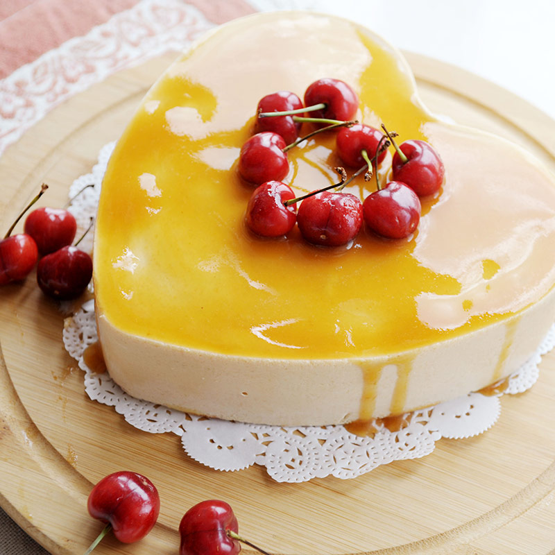5、將凝固好的慕斯蛋糕脫模,周圍沾上巧克力插片,扎上絲帶,擺上草莓,淋上濃縮檸檬汁即可。